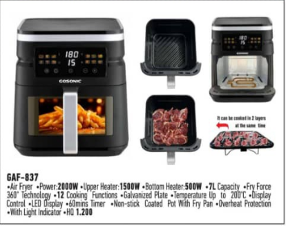 سرخ کن بدون روغن دیجیتال گوسونیک GAF-837 یکی از محصولات بینظیر با طراحی منحصر به فرد و ساخت 2024 از کمپانی گوسونیک است که سبب کاهش 80 درصدی مصرف روغن شده و غذاها را با میزان مصرف بسیار پایین یا بدون روغن سالم آماده میکند. این سرخ کن از گوسونیک دارای توان مصرفی 2000 وات است. و دارای دو المنت برای پخت میباشد و از جدیدترین و بهترین المنت های طلایی به کار گرفته شده است. گنجایش مخزن این سرخ کن 7 لیتر است. پنل کنترلی این دستگاه به صورت لمسی طراحی شده است و با یک لمس غذاهای مورد علاقهی شما را آماده میکند. سرخ کن بدون روغن دیجیتال گوسونیک GAF-837 دارای سیستم تایمر و تنظیم دما است که قابلیتهای پر کاربردی میباشند. به کمک برنامههای پخت از پیش تعیین شده میتوانید غذاهای لذیذ را در کوتاهترین زمان آماده کنید. برنامه های پخت این محصول جدید بیشتر شده و دارای 12 برنامه پخت میباشد. با این سرخکن میتوانید انواع غذا ها مانند؛ گوشت و ماهی کبابی، مرغ و میگوی سوخاری، سیب زمینی سرخ شده، قارچ خوشمزه، بخارپز کردن سبزیجات و … را آماده کنید و همچنین انواع غذای منجمد را گرم نمایید.دارای برنامه پیش گرم کن است که قبل از شروع پخت،مخزن را گرم میکند و برای گرم کردن غذای اماده هم میتوان از ان استفاده کرد.